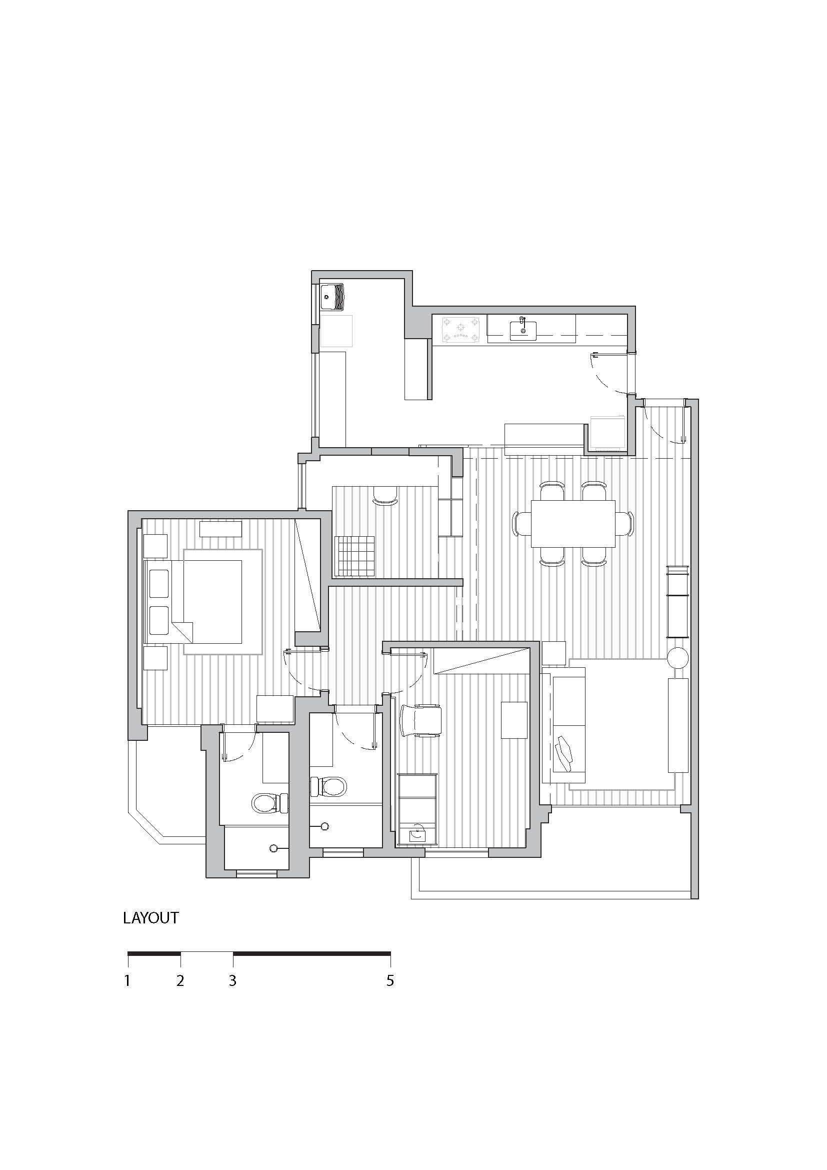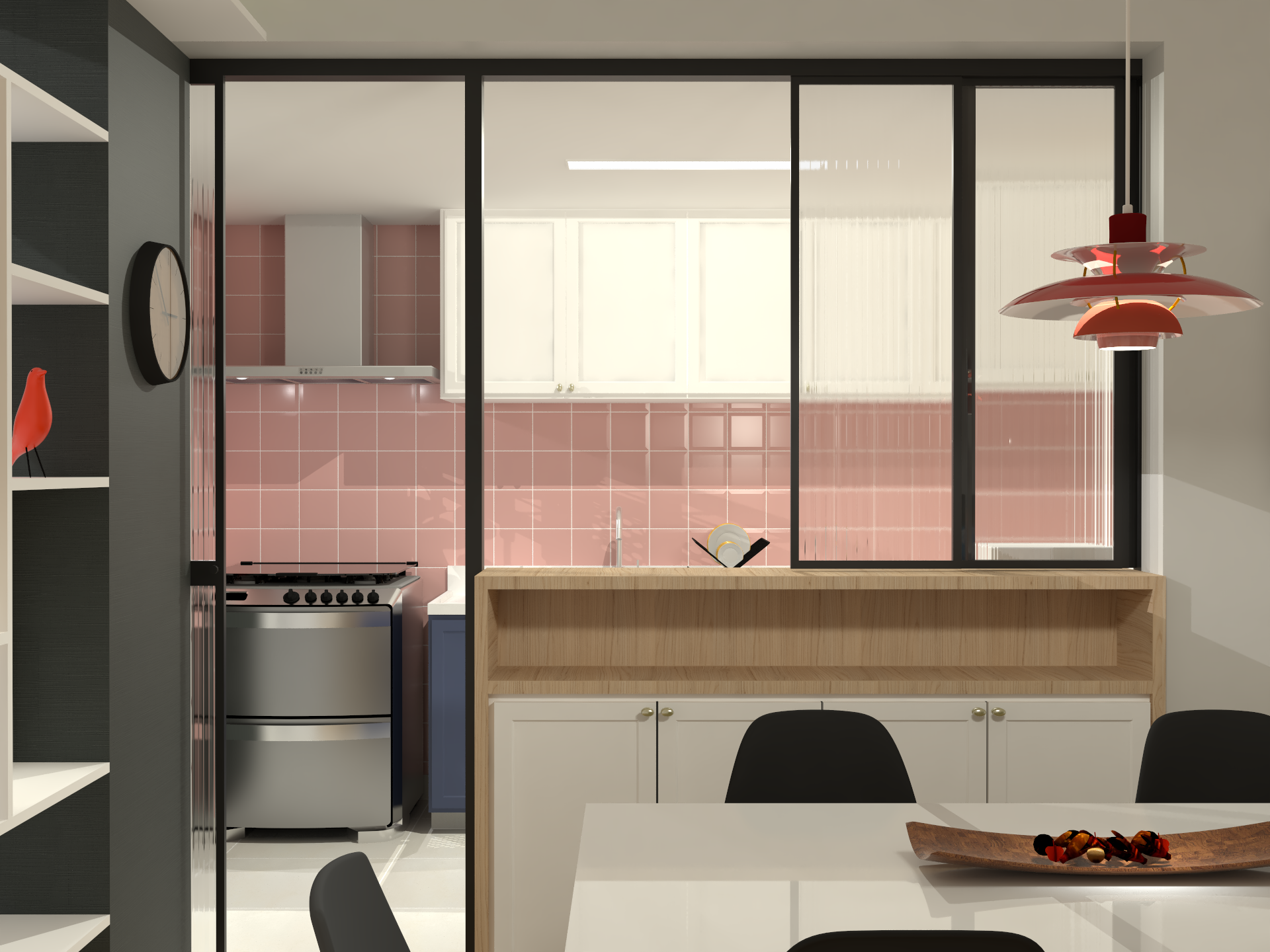 A ideia foi conectar a sala à cozinha e ao antigo quarto de serviço, agora escritório. Para tanto projetamos peças de mobiliário singulares que permitem diferentes possibilidades de uso entre esses espaços. A ideia foi de filtrar a conexão destes espaços com peças que ofereçam funções que complementem as atividades de ambos espaços, atendendo a demandas diferenciadas do dia-a-dia.