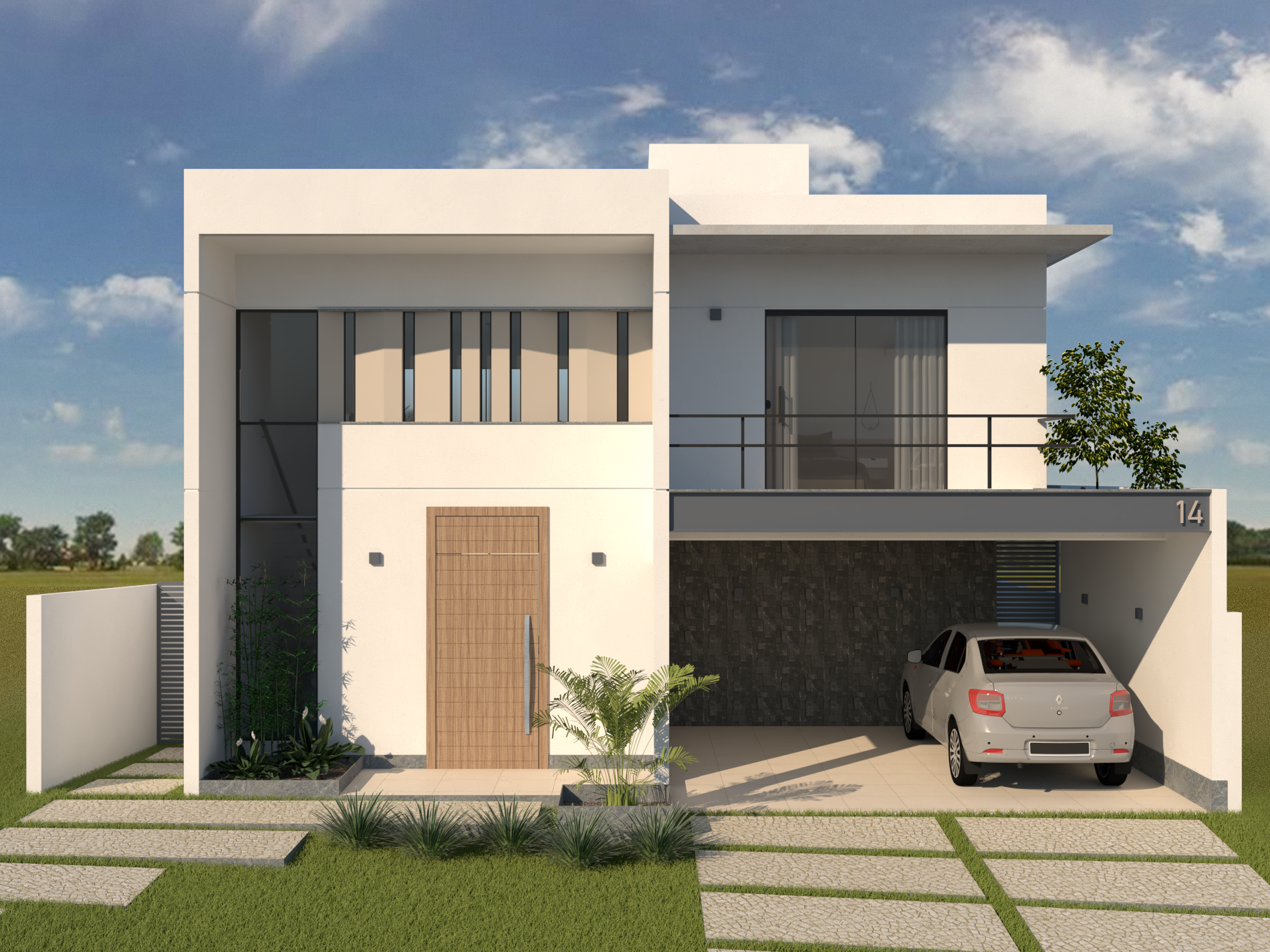 A área social da casa é marcada por duas paredes que avançam na fachada, protegendo as aberturas da iluminação poente e trazendo certa imponência para o