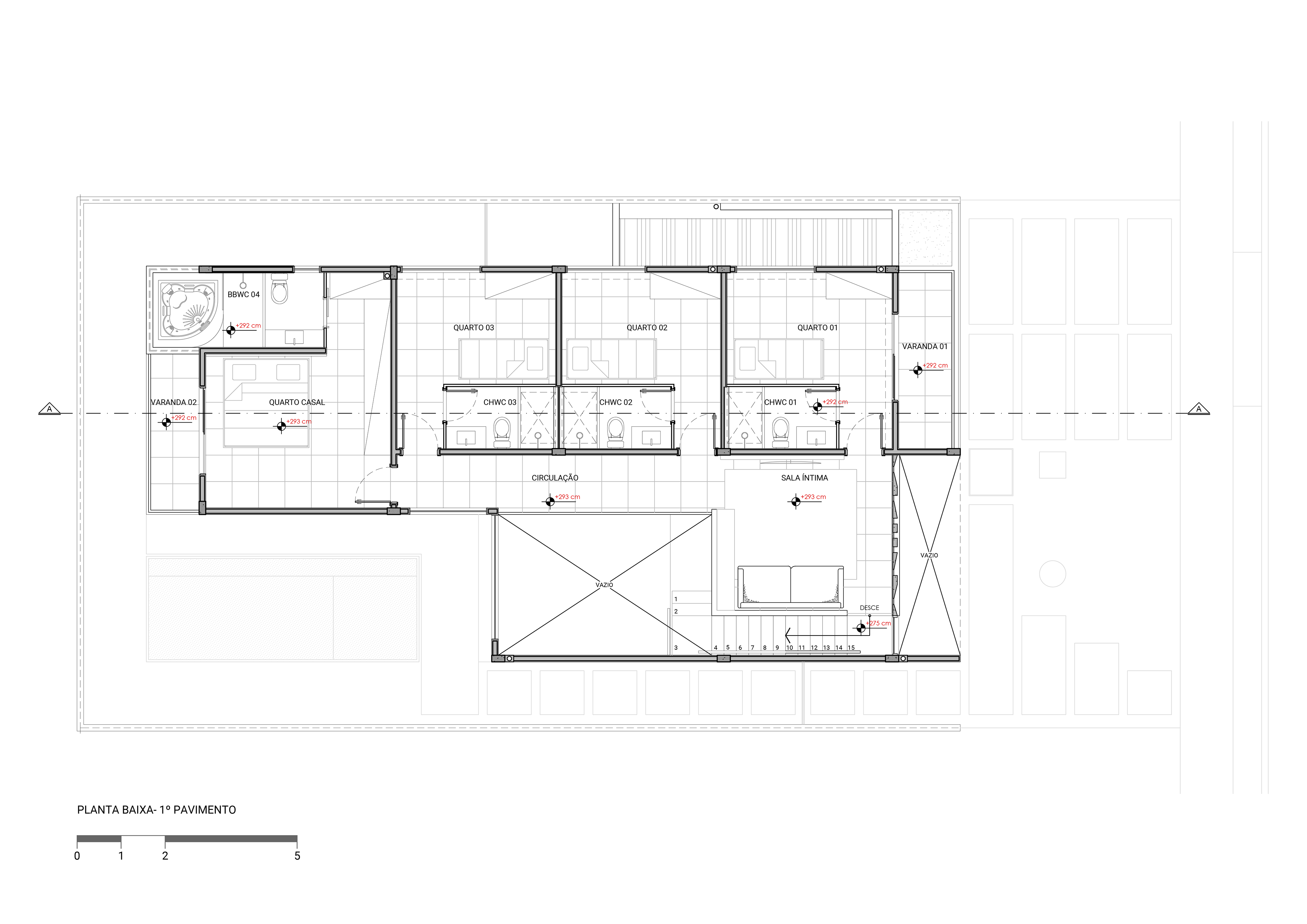 Já a área íntima, tem um beiral por sua volta que, além de cobrir as varandas, aproxima a escala do usuário.