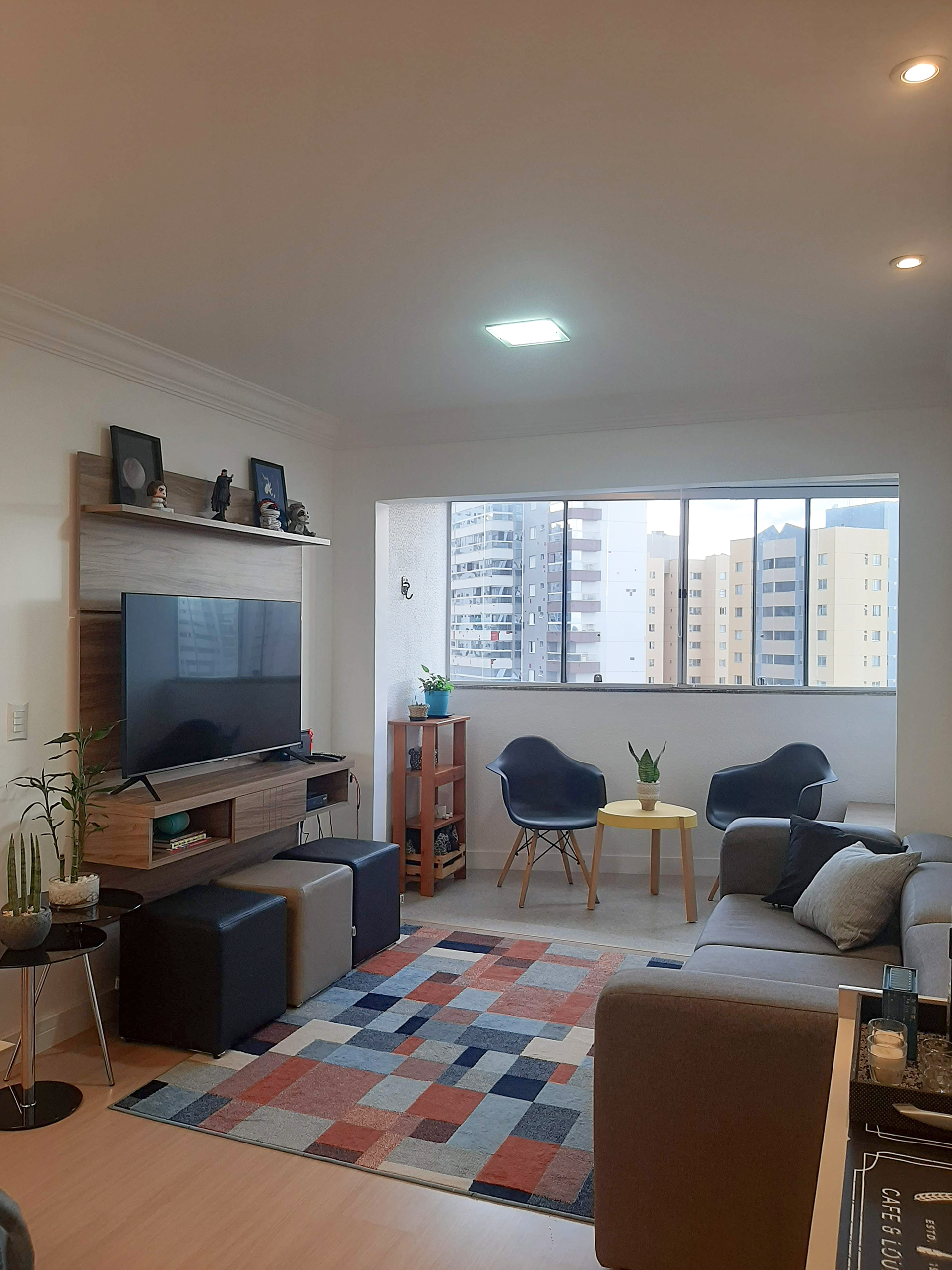 Trocamos todo o piso da área íntima, integramos a varanda à sala e reformamos os banheiros por completo.