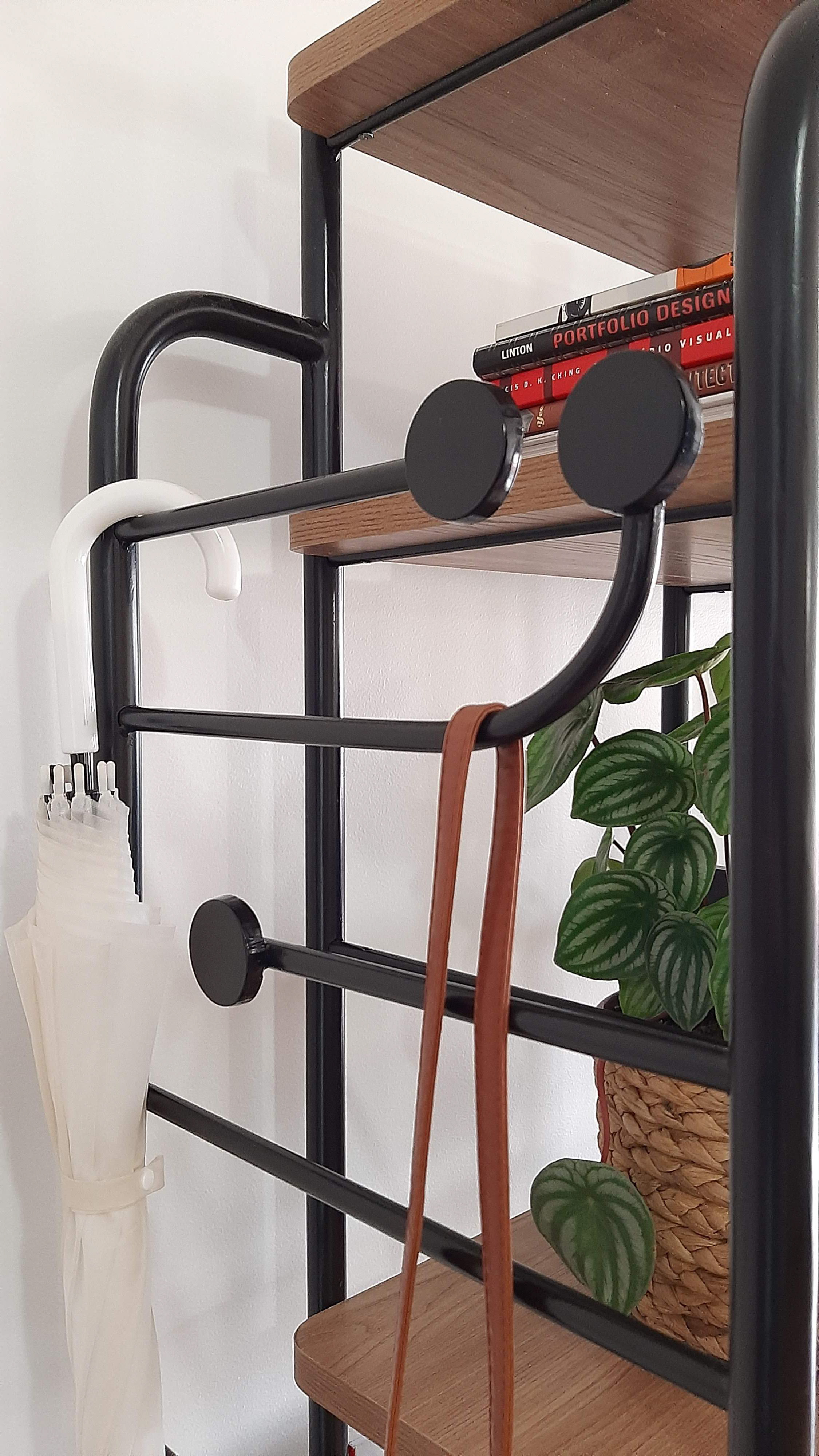 Os pegs redondos na lateral são um ponto focal da estante além de servirem como mancebo.