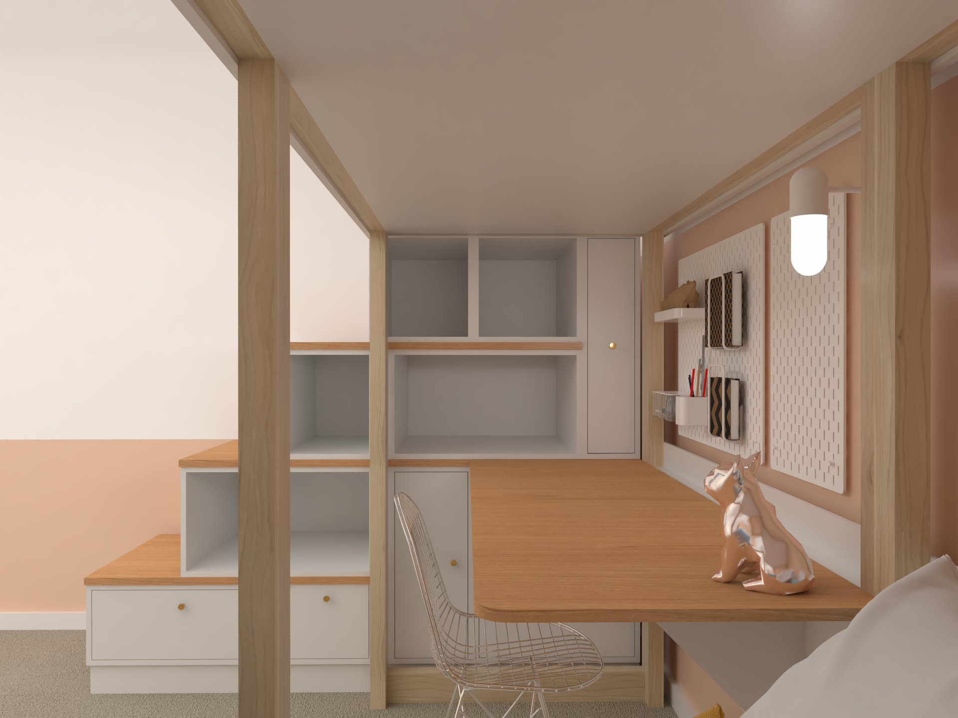 A cliente nos procurou com a intenção de criar algo personalizado, sob medida e de fácil execução. Propomos uma cama beliche em painéis de compensado laminado, estruturada em perfis de 2x6" e 2x4". Ampliamos a plataforma superior criando um espaço para armazenagem, e assim por consequência estendendo a área de estudos também.